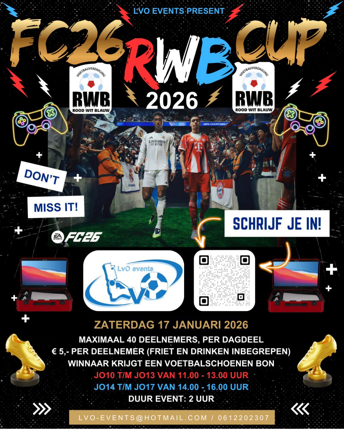 Home E Nieuws E FC26 R.W.B. CUP Zaterdag 17 januari 2026 FC26 R.W.B. CUP Zaterdag 17 januari 2026 Een tof evenement voor onze oudste jeugd. Inschrijven maar!! Lees het volledige bericht Al 't nieuws