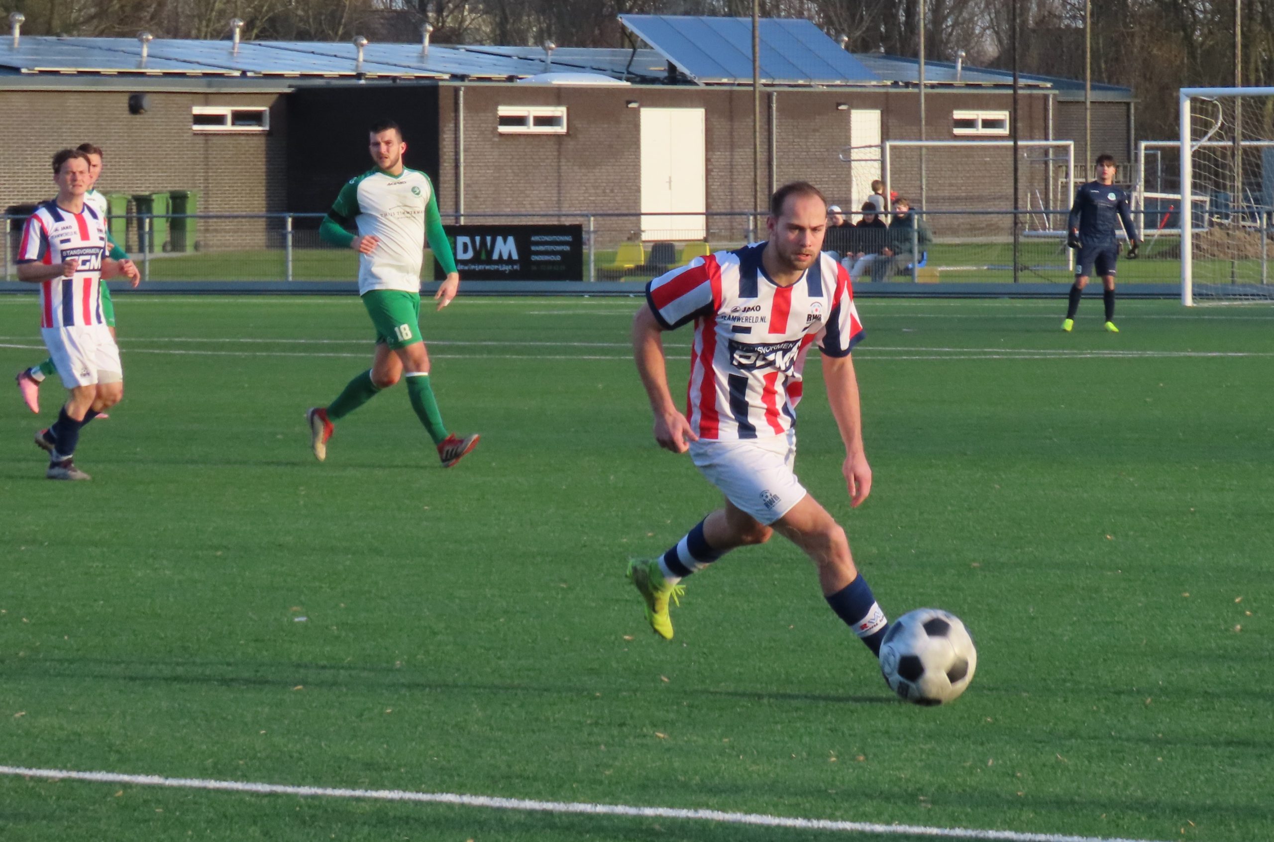 Na de winterstop en het trainingskamp in Torromolinos begon RWB scherp aan de wedstrijd. Al in de tweede minuut opende Bram van Iersel de score. RWB hield het initiatief en breidde de voorsprong via doelpunten van Djay Kogels (10e minuut) en Koen van Baardwijk (19e minuut) verder uit. De ploeg combineerde verzorgd en was in de eerste helft duidelijk de bovenliggende partij.