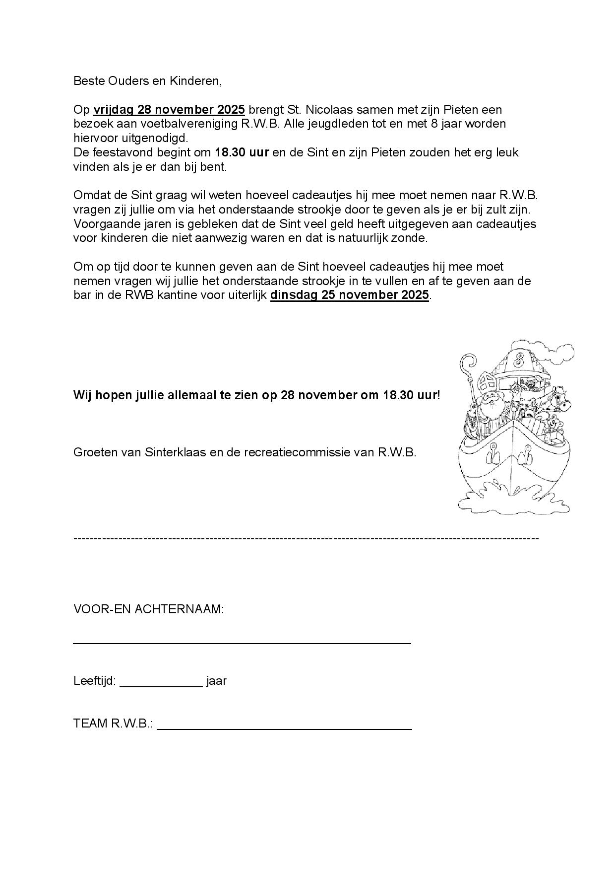 De Sint en zijn Pieten komen voor alle kinderen t/m 8 jaar op vrijdag 28 november om 18.30 uur naar RWB.