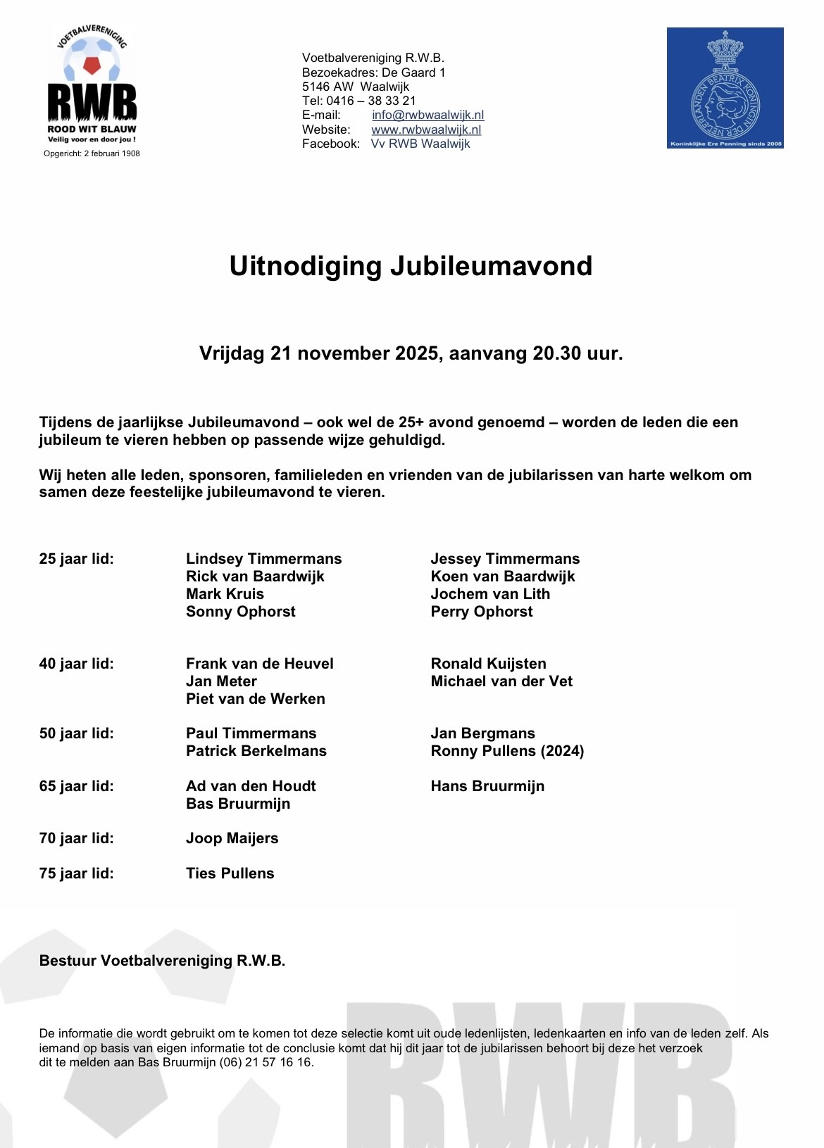 Het bestuur roept alle leden, oud-leden en supporters op om deze avond bij te wonen. Degenen die worden gehuldigd hebben met hun inzet en loyaliteit veel betekend voor RWB en verdienen het om in een volle kantine de waardering van de vereniging te ontvangen.
