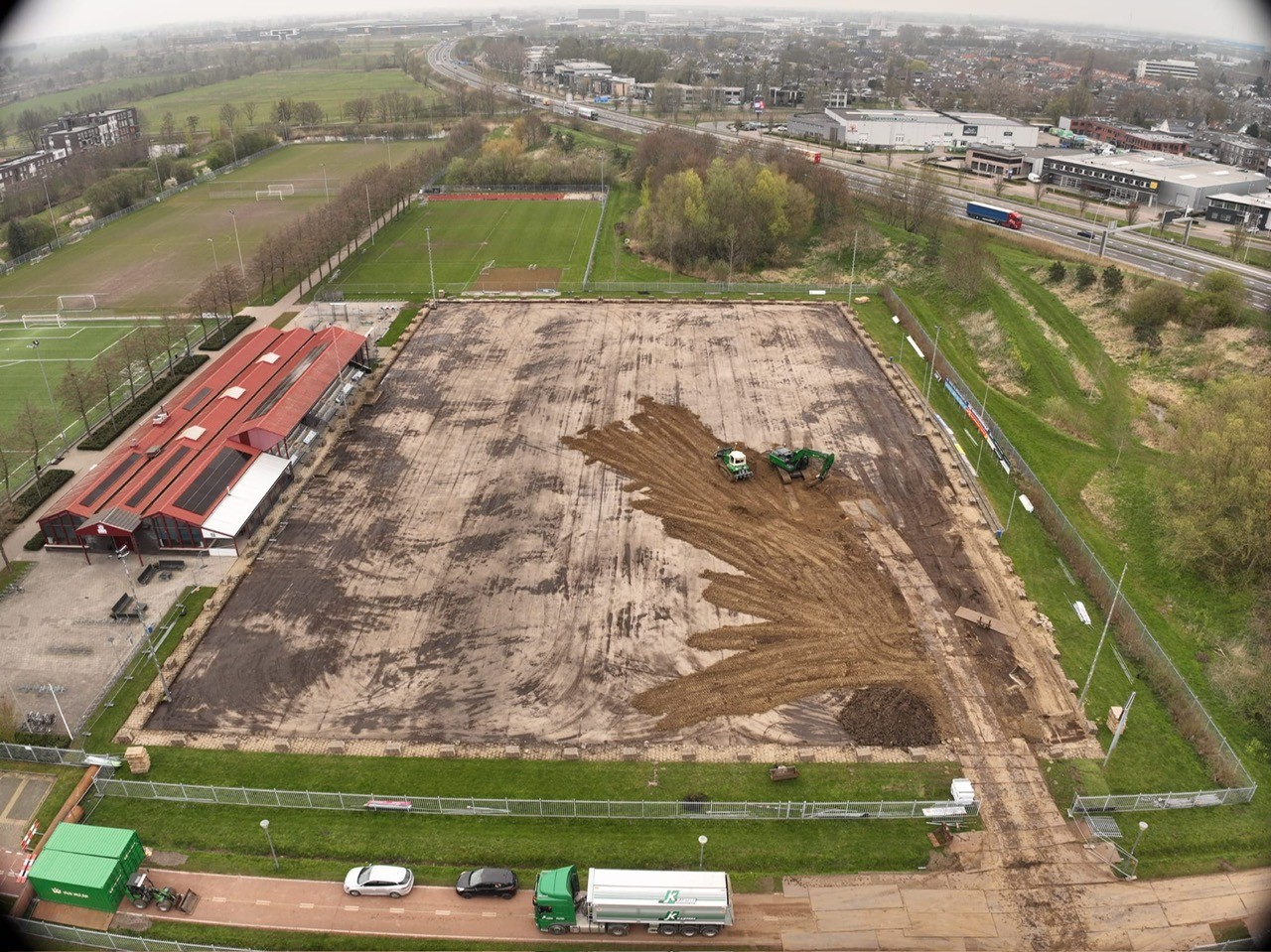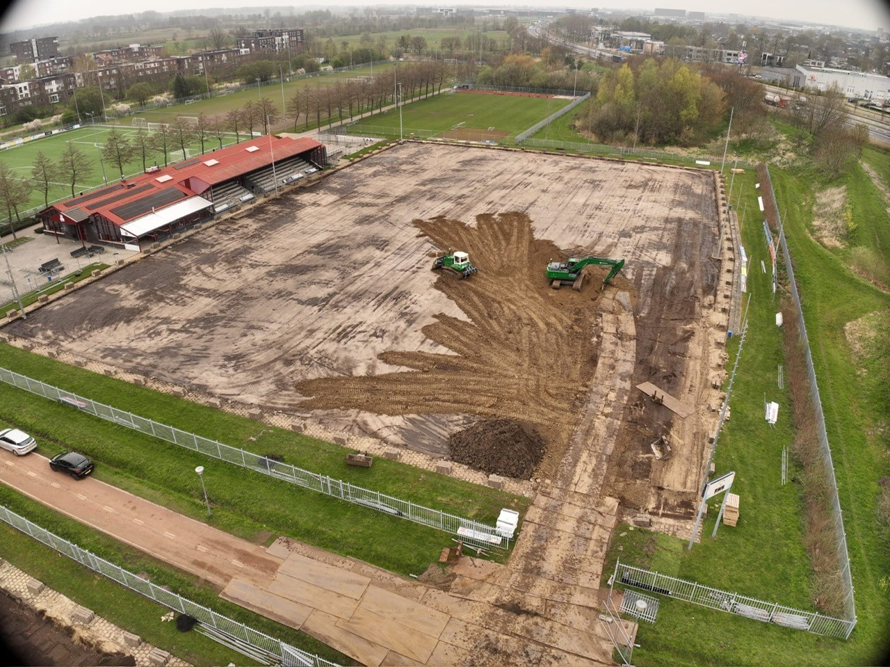 Inmiddels zijn de doelen, de reclameborden met het leunhek, de ballenvangers en de dug-outs verwijderd en is het oude veld volledig afgegraven. De aannemer is daarna gestart met de opbouw van het nieuwe veld. Op dit moment wordt er gewerkt aan het aanbrengen van een waterdichte kleilaag.